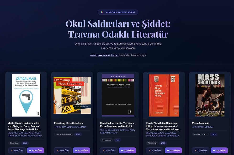 Okul güvenliğinden saldırgan psikolojisine, hayatta kalanların deneyimlerinden epigenetik miraslara kadar uzanan bu geniş literatürü Türkçeye daha yakın kılmak amacıyla özel bir çalışma hazırladık.